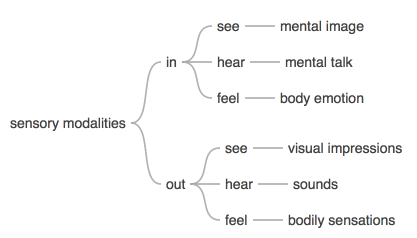 As a scientist with a knack for elegant categorization, Shinzen proposed a system which identifies 6 types of sensory modalities, composed of the 3 outer and 3 inner versions of see, hear, feel.se Agent.